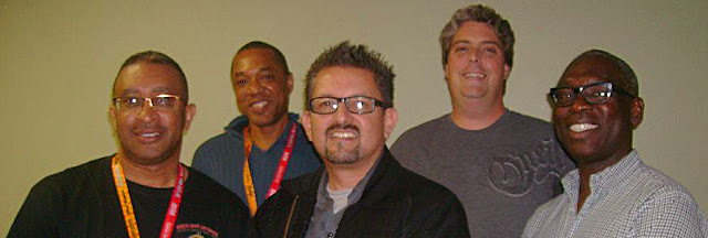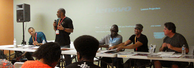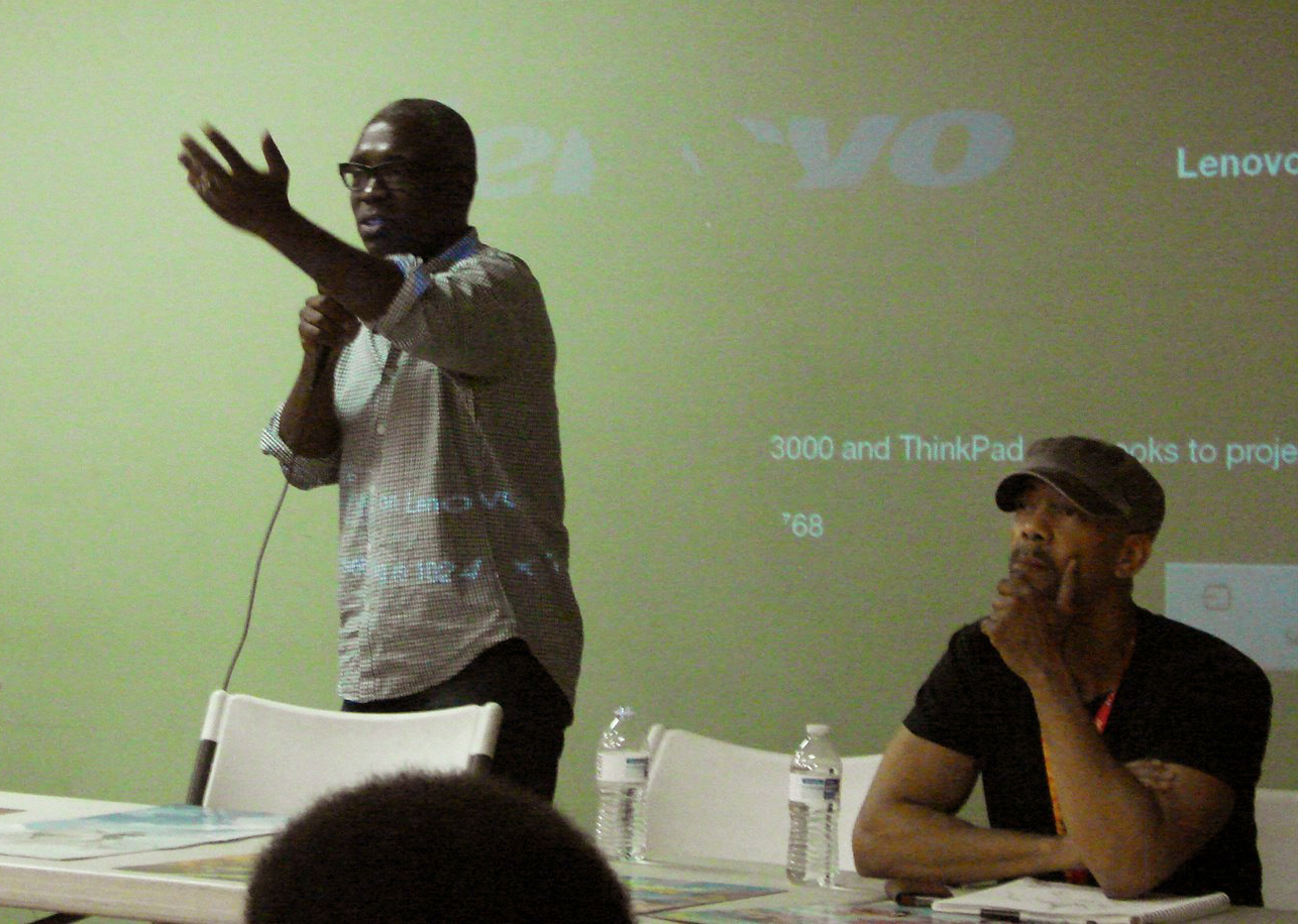 | David G. Brown addresses the audience. From left: Jerry Brice, Brown, Roland Poindexter, Denys Cowan, Brad Constantine |